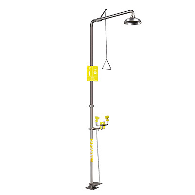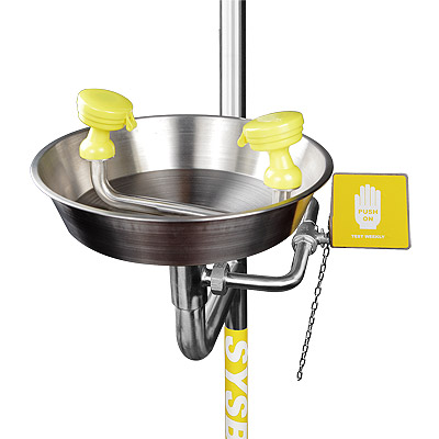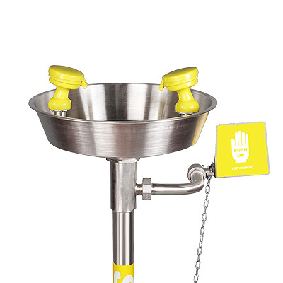 符合ANSI Z358.1-2014 和AS 4775-2007关于紧急洗眼和冲淋设备的规定; 304不锈钢管件适用于较恶劣的环境中; 推手和脚踏均启动洗眼/脸设备; 210kPa(30psi)的水压下,洗眼/脸器出水量高于11.4LPM(3.0GPM)的最低要求; 洗眼器喷头可将水同时并持续,均匀,柔和地冲洗到面部和脸上; WG7033FY采用AES塑料的水盆,颜色为亮黄色,易于观察。具有抗氧化,刚度高,韧性好等特性;